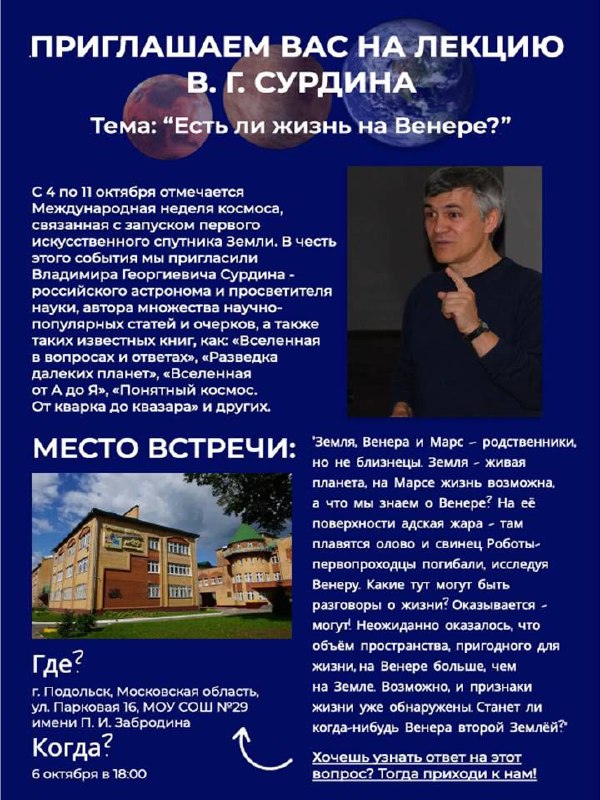 ON AIR 6 октября в 18:00, в средней общеобразовательной школе № 29 имени П. И. Забродина, г. Подольск, состоится лекция Владимира Георгиевича Сурдина. Вход - свободный!